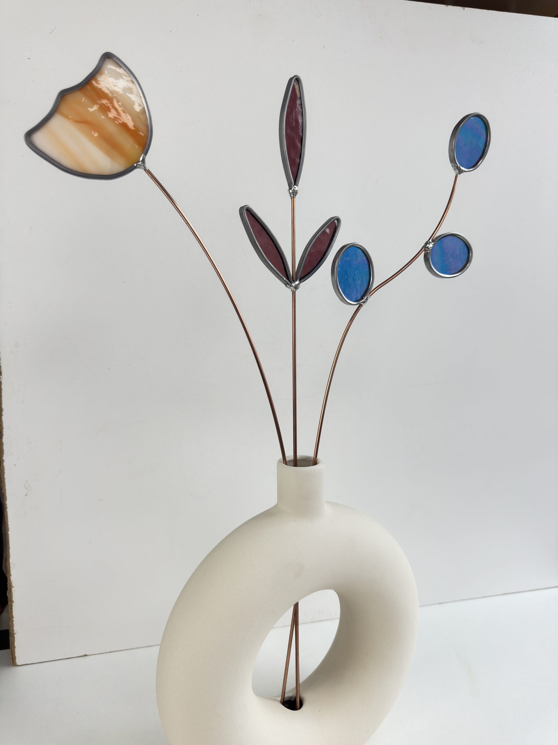 Deze set glas in lood bloemen schitteren in een modieuze donut vaas. De drie geselecteerde bloemen zijn persoonlijke favorieten. Je ontvangt de vaas inclusief een Tulipa whispy apricot van opaalglas, de Judas branch van blauw irirserend glas en de Twig purple van donkerpaars kathedraalglas.