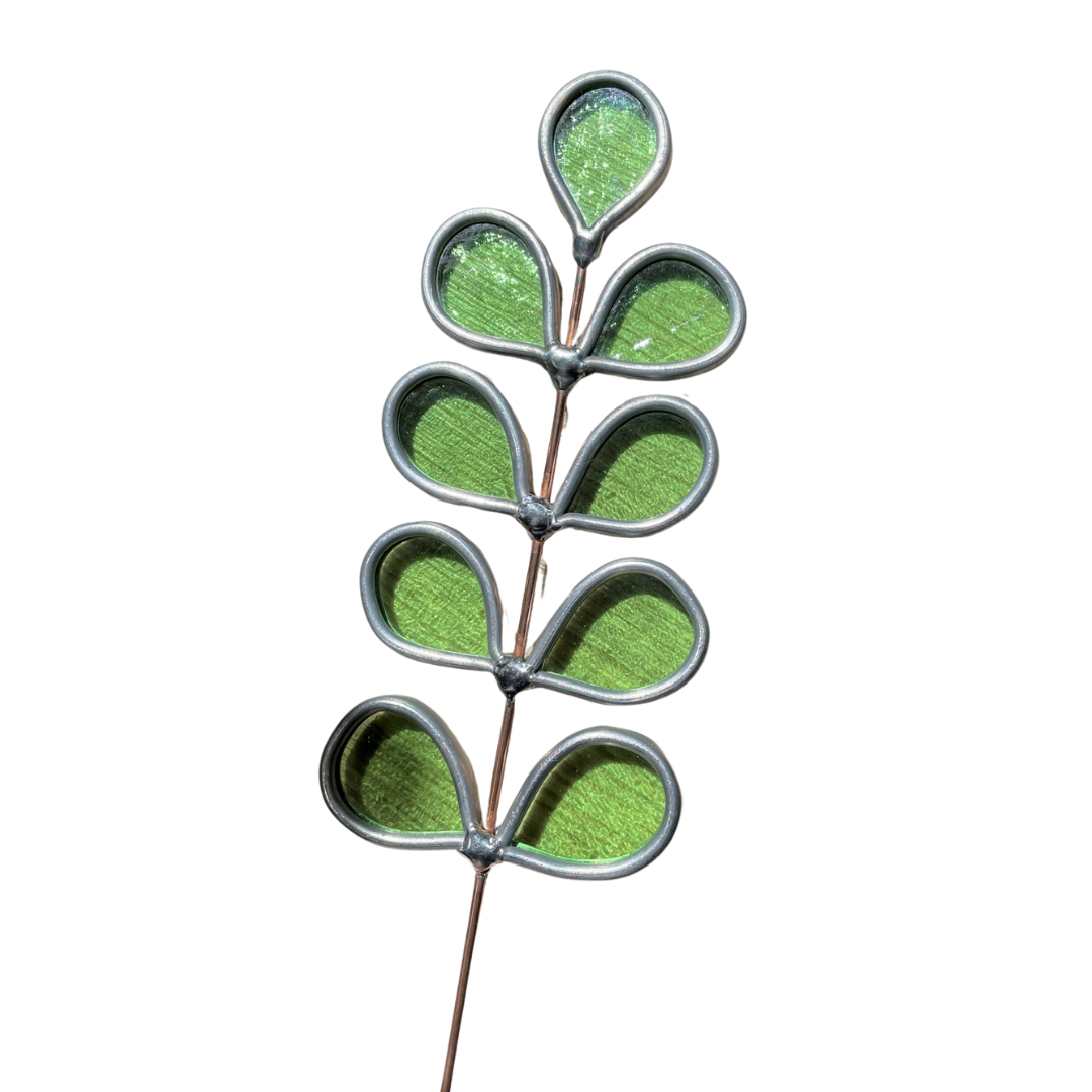 Deze Happy Greenz van glas in lood is met de hand gesneden uit zachtgroen kathedraalglas. Daarna zijn de blaadjes zorgvuldig met lood omrand wat de afgeronde blaadjes een stoere look geeft. De blaadjes zijn gesoldeerd op 2 mm dik koperkleurig staaldraad. De steel is eenvoudig in te korten met een sterke nijptang.